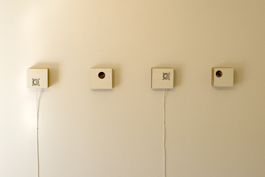 rosewood and cherry blocks, oil paint, speaker cones, photographs, speaker wire, sound, light